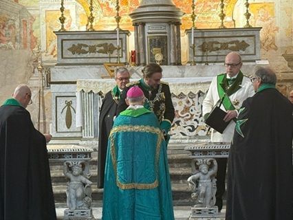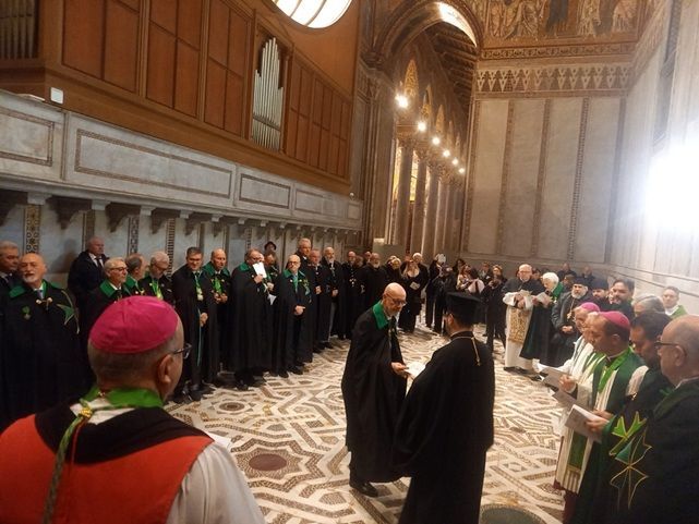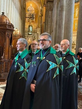Finally, on Sunday morning, at the Roano Chapel, inside the Cathedral of Monreale, in the presence of the Grand Master and presided over by the Major Chaplain of the Grand Bailiwick, Archbishop Isacchi, the solemn rite of oath and installation of the new Ecclesiastical Grand Prior, Bishop Lindsay Urwin OGS, took place. After taking the oath, he was invested with the episcopal cape and mitre by the two Catholic and Orthodox deacons. After exchanging the sign of peace with the outgoing Ecclesiastical Grand Prior, Archbishop Michele Pennisi, he was introduced to all the knights present at the entrance to the chapel and imparted his first blessing to all those present. Immediately afterward, the procession began, winding from the cathedral to the Chapter Church of the Sacred Heart, where the Pontifical Mass of Investitures took place, presided over by Archbishop Isacchi and concelebrated by Archbishop Pennisi, the Eparch of Piana degli Albanesi, the Abbot of San Martino delle Scale, and other priests.