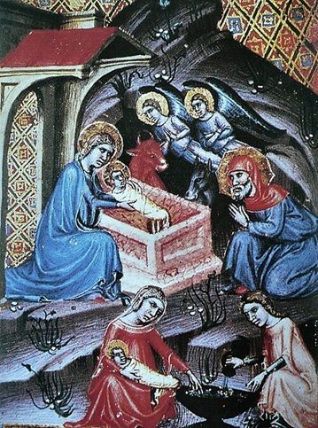 (The Nativity, Miniature from the Book of Hours of Mary of Navarre, 1340, Marciana Library, Venice)